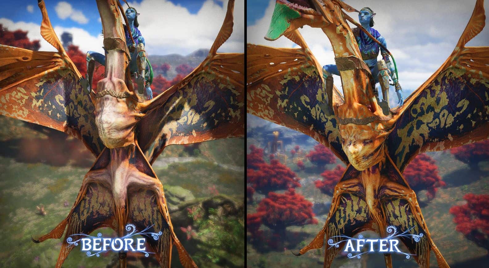 This mod will make all ikran in the game have much more vibrant colors on the underside of their wings and chest. Typically, the belly will fade into a pale peach color, but this mod will dramatically reduce this peach color but still will keep the color of the spiracles, mouth, and claws.